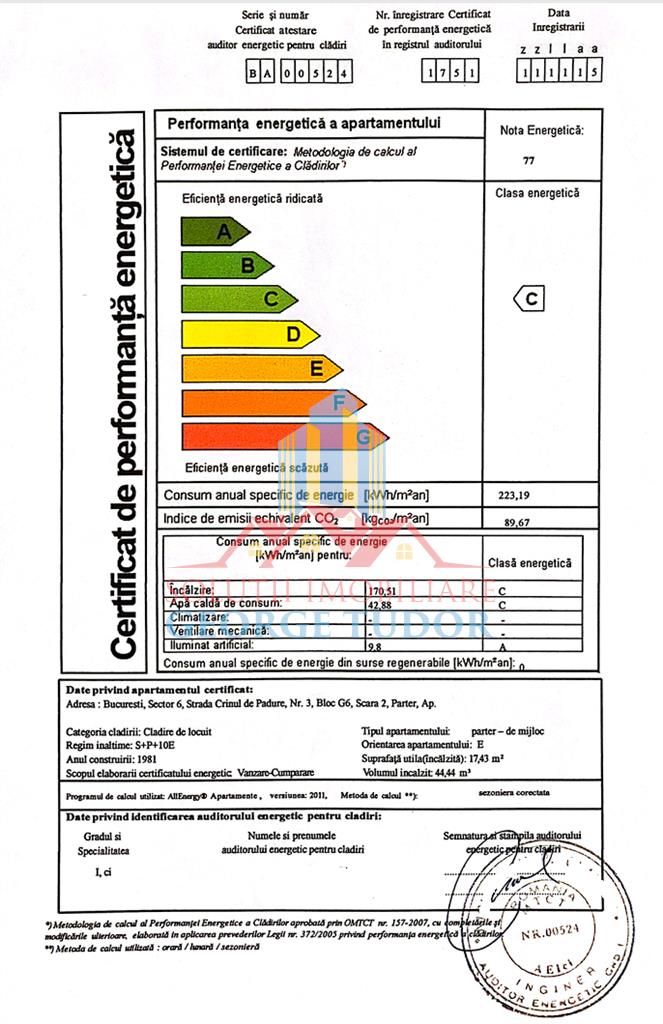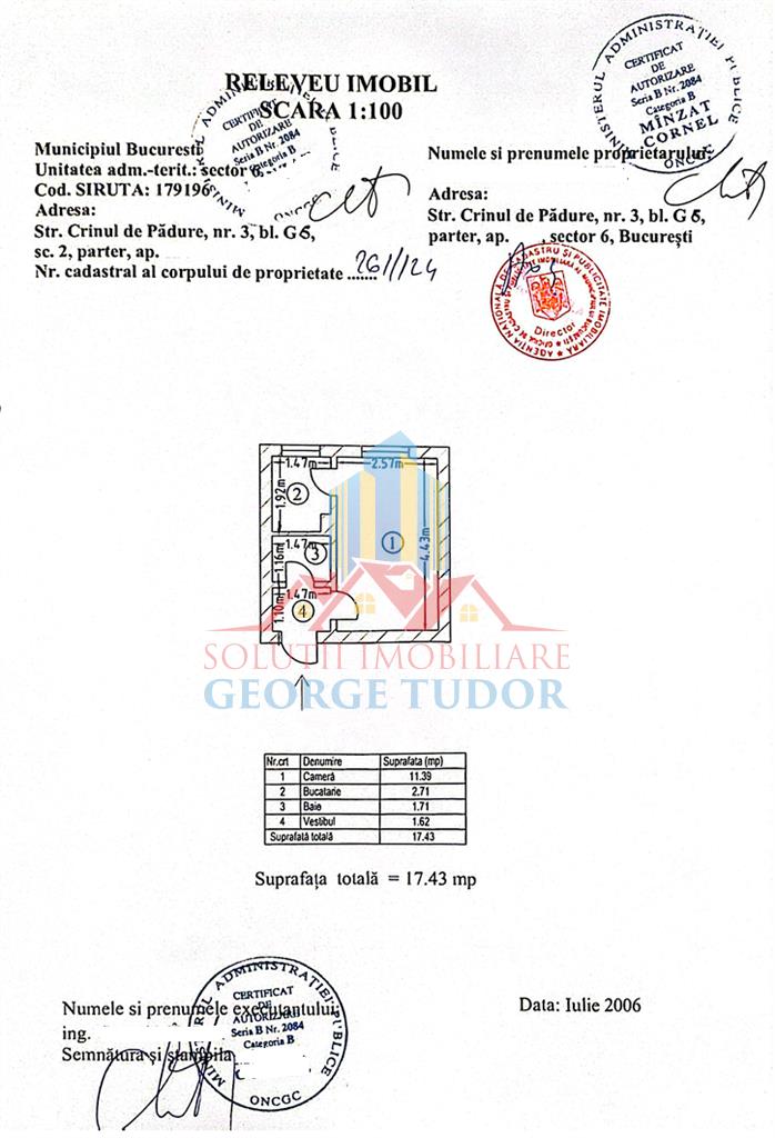 Solutii Imobiliare George Tudor, reprezentat de agent imobiliar Ionut Grigore, va propune spre vanzare o garsoniera situata pe Str. Crinul de Padure, Nr. 3, Bl. G6, SC. 2, Sect. 6, intr-un imobil construit in anul 1981, disponibila la parterul al unui bloc cu 10 etaje, cu o suprafata totala de 17,43 mp ( 11,39 mp living + 2,71 mp bucatarie + 1,71 mp baie + 1,62 vestibul ).